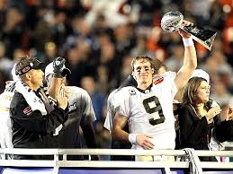 | Brees lifting the Vince Lombardi trophy. |